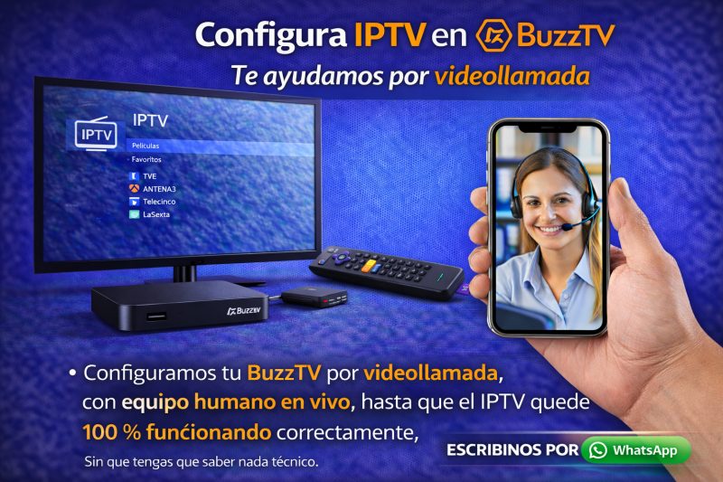 Los dispositivos BuzzTV son muy utilizados por usuarios que buscan un receptor IPTV potente, estable y pensado específicamente para televisión por Internet. Gracias a su sistema optimizado y a sus aplicaciones dedicadas, BuzzTV ofrece una excelente experiencia, pero configurar IPTV en BuzzTV puede resultar confuso si no se tiene experiencia previa con este tipo de equipos. Por ese motivo, en ConfiguraIPTV ofrecemos un servicio de configuración de IPTV en BuzzTV mediante videollamada, donde un equipo de personas reales te acompaña hasta dejar todo funcionando correctamente.